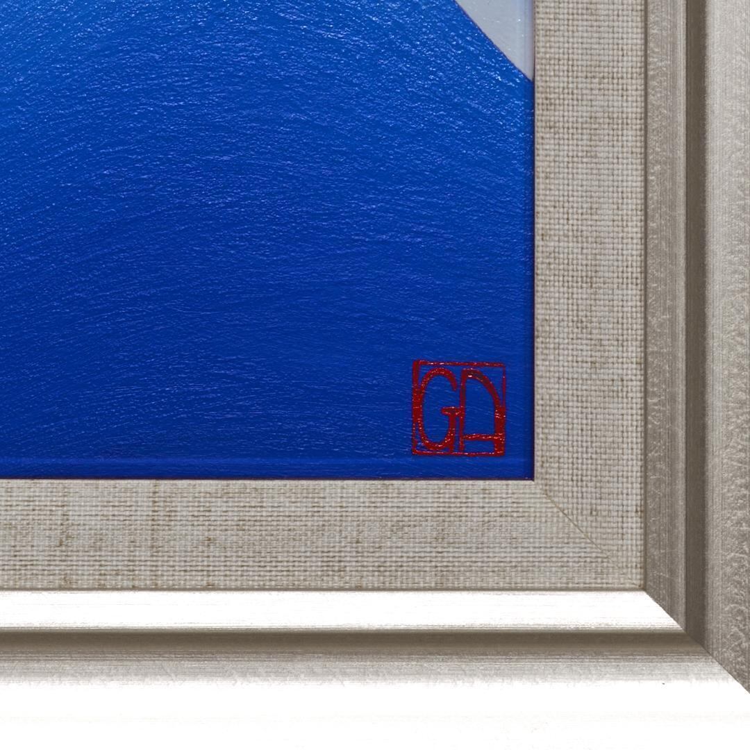 こちらの作品の油絵は美術館の照明下で150年褪色しないと言われるオランダのレンブラント油絵具ですべて描いております。それでも薄いと経年で色が飛びやすく(薄く)なるため、それなりしっかりとした厚みを持たせて、見ていて気持ちの良い爽やかめの青に仕上げてます。