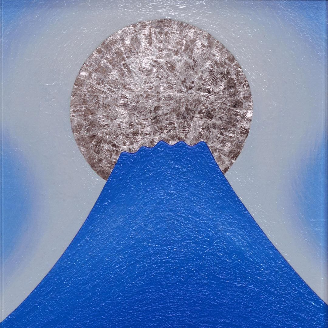 『青嶺円照』●SM油彩額付タテ36.3cm銀プラチナシルバー満月富士山がんどうあつし油絵