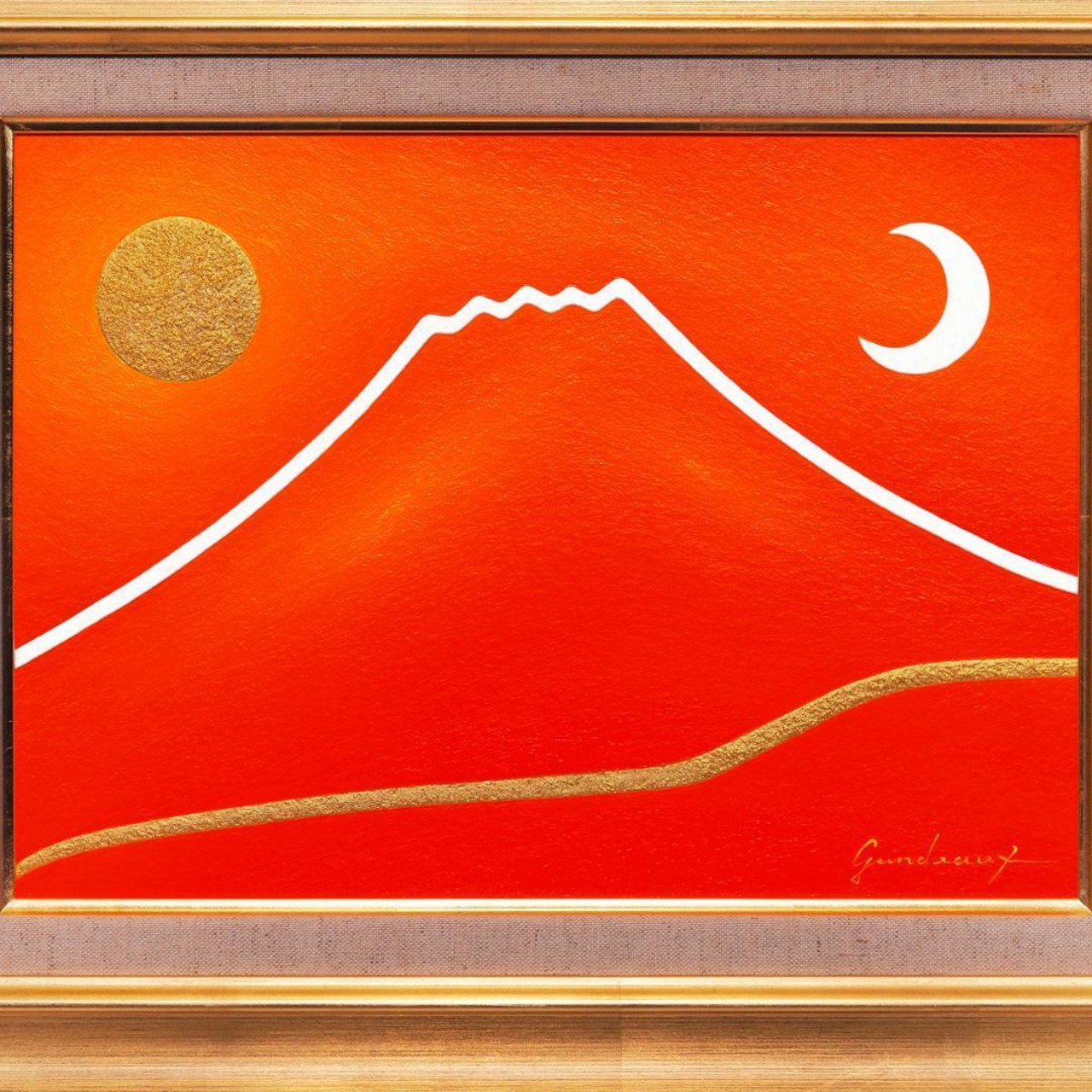 技法 キャンバスに油彩(REMBRANDT等、サインと富士山に当たる光の仕上げはLEFRANC) 国産本金箔四号色 金泥 粒膠 LiquitexPRIME・白(チタニウム) 下地大理石粒・U35メディウム等