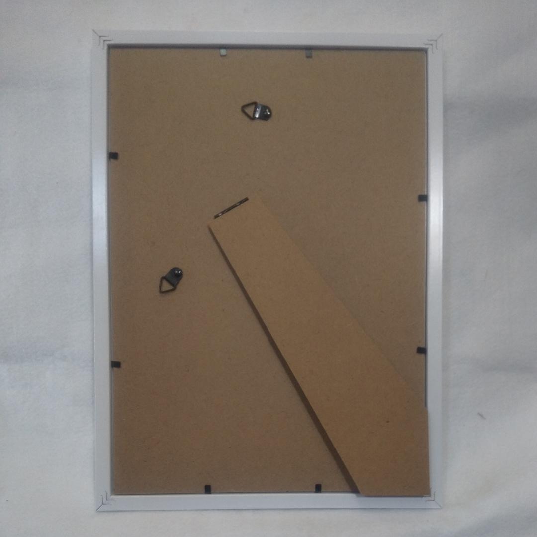 額は軽くシンプルな仕様で、UVカット率80%の硬質カードケースを使った簡易額装です。作品を紫外線から守りつつ、気軽にお楽しみいただけるよう仕上げています。