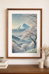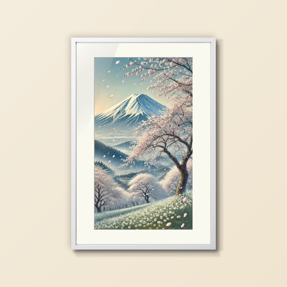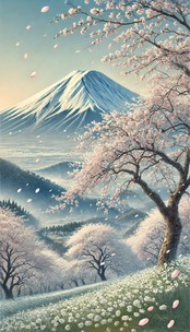 やわらかな光の中、舞い落ちる花びらと、佇む富士の姿を表現しています。